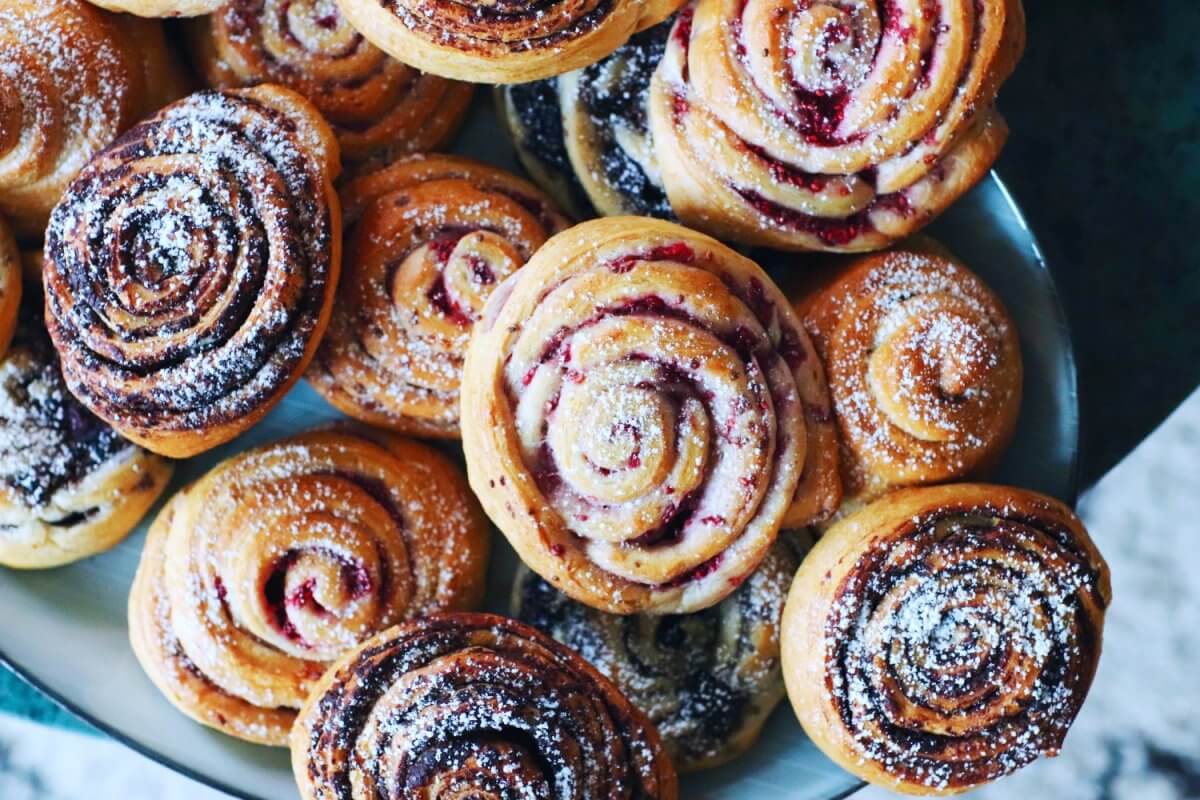 Wist je dat je ook jam op het deeg kunt smeren voordat deze de oven in gaan? Zo trekt de jam heerlijk in het deeg. Knijp de snijlijntjes aan elkaar vast, en rol daarna het deeg weer terug tot een rol. Als je deze in plakken snijd krijg je deze prachtige rolletjes. Zie ons receptje hier.
